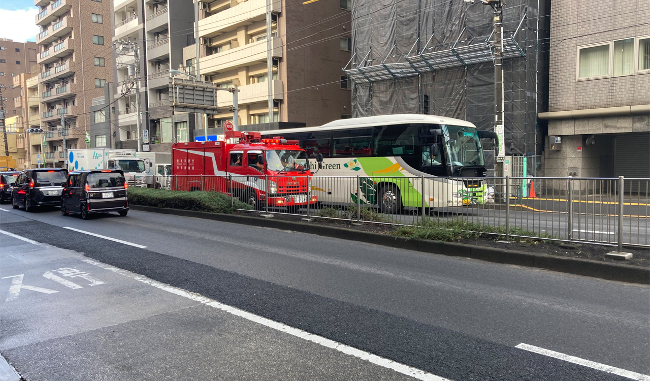 現場は2車線の交互通行。パナソニックの看板のあるあたりから中央分離帯が始まりやがて右折車線が加わる。観光バスが停まっているのは右折車線が始まる手前のところ。写真からわかるように観光バスと歩道の間が空いているから左に寄れるはずだ。前方にも前に進んで左に寄るスペースは十分にある。それなのに観光バスは微動だにしない。遠目に運転手がじっと前を見据えているのがわかる。動く気配もない。消防車に勝手に迂回していけと言わんばかりに。看板もしょっているのに観光バスの運転手は何を考えているのだ、と毒づきたくもなる。
