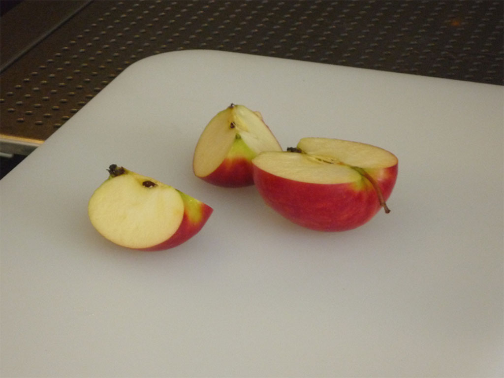 りんごを8等分する。くし型になったひとかけらが45度の刃をした包丁だと考える。モノに対して真っ直ぐに切り下ろした場合を想定して、りんごの切れ目に直角に切ってみてほしい。どうだろう。断面は変わらず45度をしているはずだ。