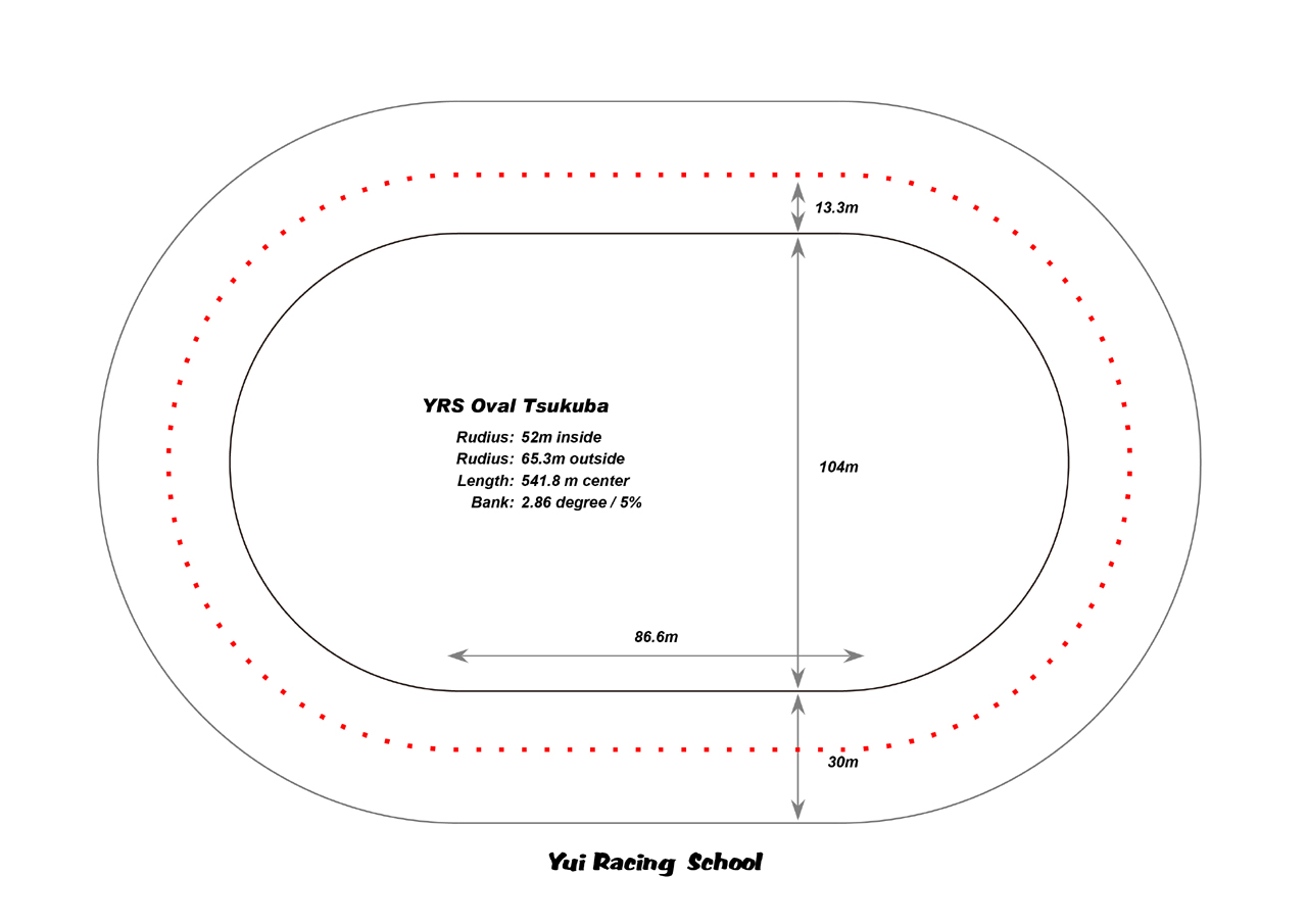 一般には使えないのですが、2016年4月に開催して以来、ユイレーシングスクールでは今回このオーバルコースでYRSオーバルスクール筑波を開催できることになりました。ユイレーシングスクールらしく30mの走路をパイロンで規制し13mあまりに。直線部を長くとって加速、減速、旋回を明確に練習できるように配慮しました。インサイドで測って半径52mもあるコーナーは、イーブンスロットル、イーブンブレーキ、トレイルブレーキングの練習に最適なコースです。