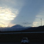 スクールで使うコースを作っていると、沈みゆく太陽が富士山の陰を雲に…。