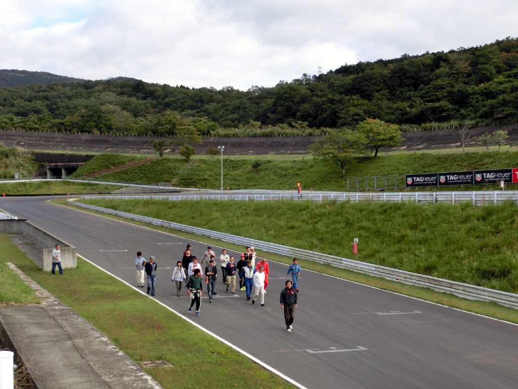 YRSツーデースクールの2日目はサーキットを歩くことから… (背景に見えるのが30度バンクの名残り)