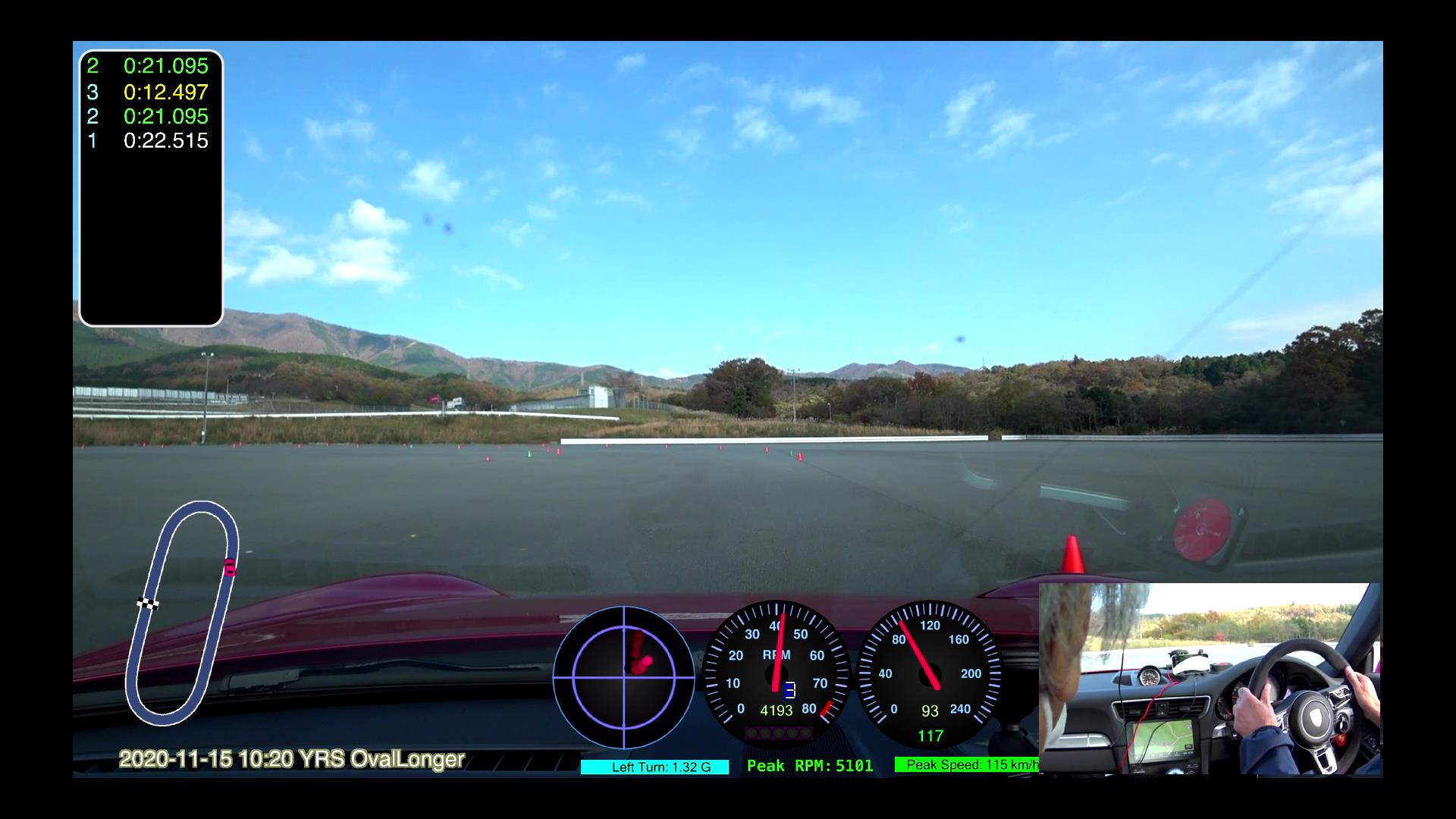 Iさんのポルシェに積まれていたロガーによると、YRSオーバルスクールFSWロンガーの下のコーナーで1.35Gの横向き加速度を記録している。太いリアタイヤのおかげか。それだけのコーナリングフォースを4本のタイヤが発揮したということは、クルマが受けていた遠心力がそれだけ大きかったということであり、それだけの遠心力を発生するほどコーナリング速度が速かったという証明に他ならない。クルマもタイヤも運転手もいい仕事をした、ことになる。