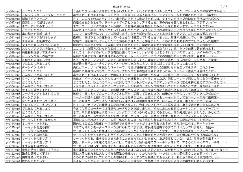 ぜひYRS CDを聞いてみて下さい。ユイレーシングスクールの座学とスクールでのアドバイスを集約して収録した音声CDです。実際にスクールを受講しなくても、ご自身のクルマを題材に自習できるような内容になっています。録音時間5時間半のCDはクルマの運転を間違いなく次のステップに導きます。