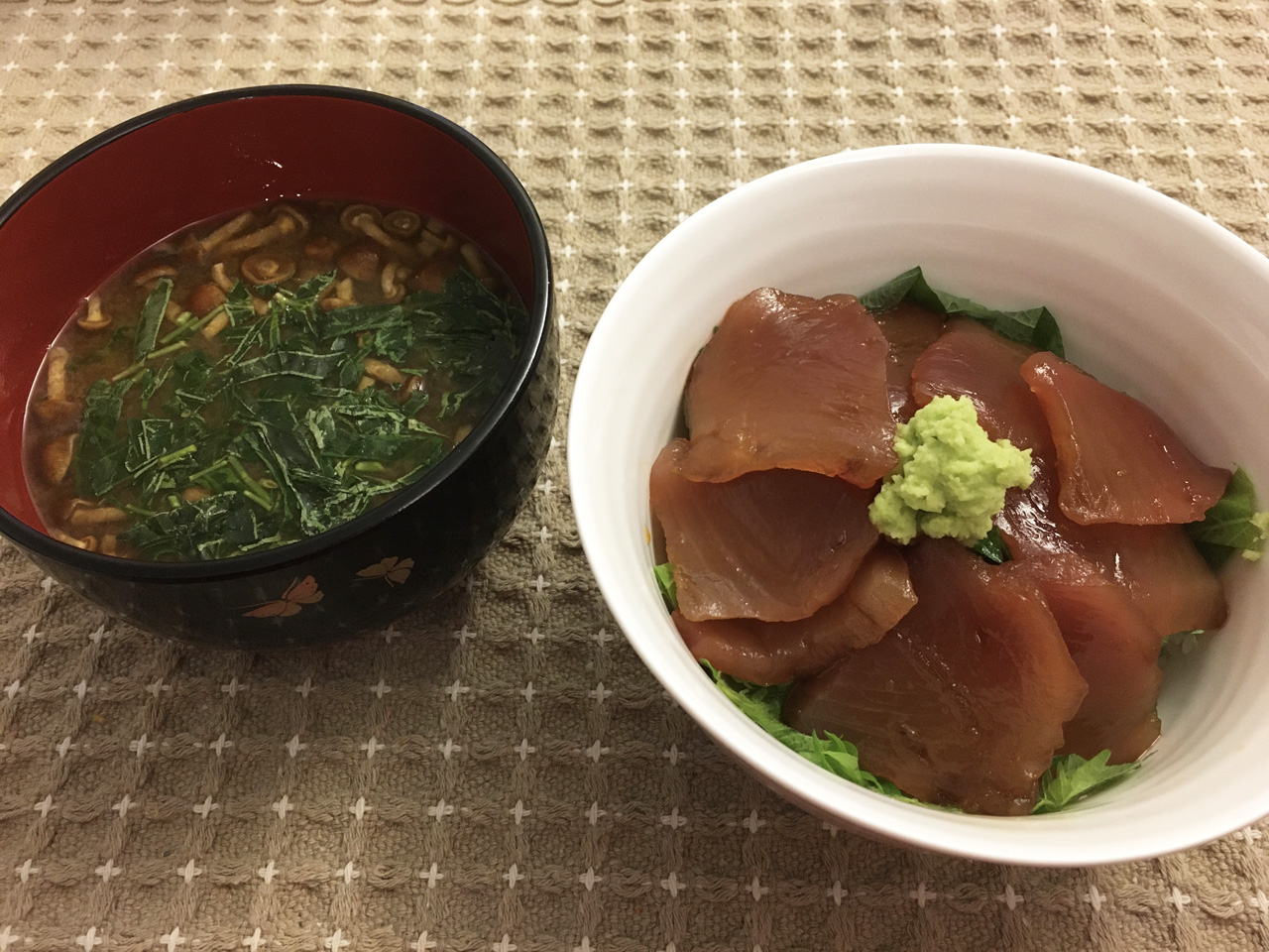 汁物はお豆腐になめこの赤だし冷凍三つ葉添え
