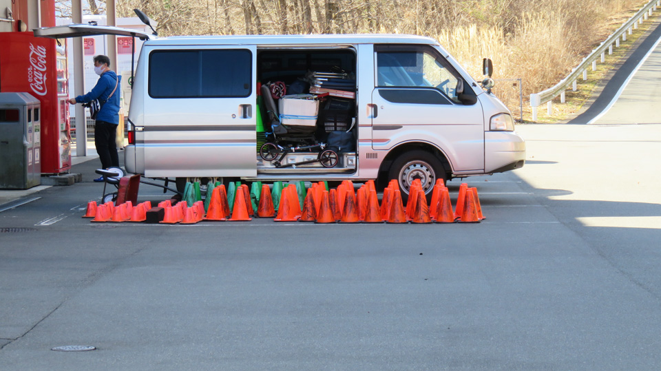 土曜の雨量を心配しながらパイロンを並べて