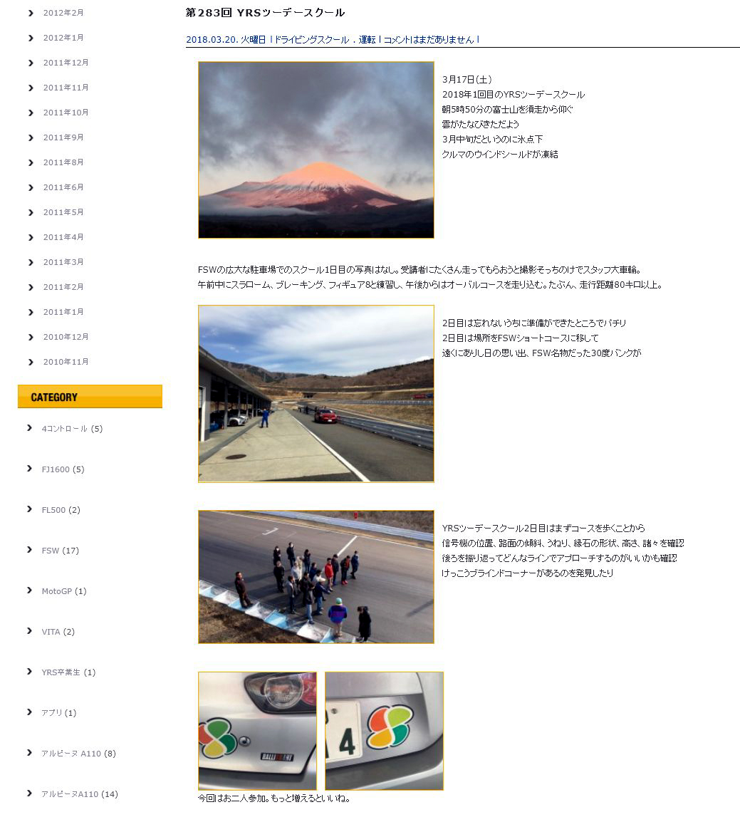 Oさんは2003年5月。55歳の時に筑波サーキット公式ドライビングスクールで初めてユイレーシングスクールに参加してくれた。2006年に始めて今年3月までに19回開催したYRSツーデースクールFSWには2011年11月に初めて来てくれた。2015年の年末に開催したYRSツーデースクールFSWを欠席した以外は18回参加。2016年からは皆勤賞。その他にもYRS筑波サーキットドライビングスクールやYRSオーバルスクールFSWにも参加してくれて計82回ユイレーシングスクールに参加してくれた。70を過ぎてからは自慢の愛車に高齢者マークを貼って、若者に負けない速さを見せつけてくれていた。