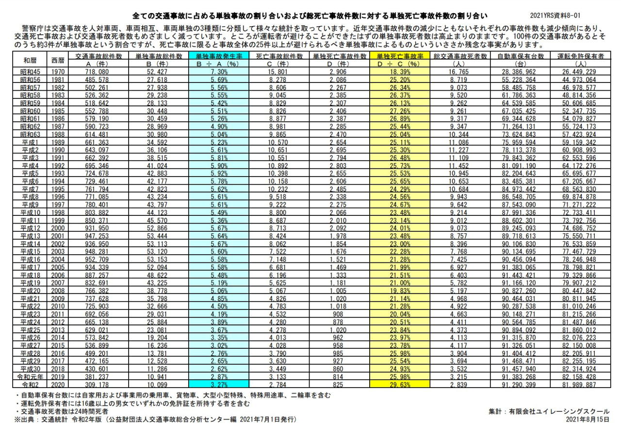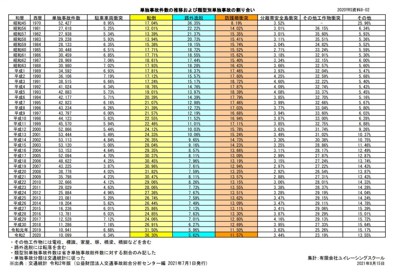 ・交通事故全体に占める単独事故の割合は記載が始まった1970年の7.30%から減少を続け、2018年には過去最少の2.62%を記録したが、2019年からは増加に転じ2020年には3.27%に達した。
