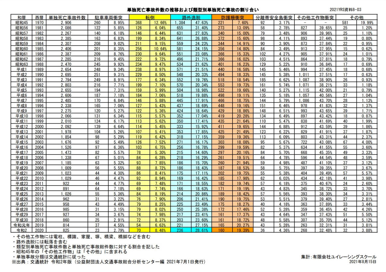 ・死亡事故にいたった単独事故件数は1992年の2803件が過去最多で、その後減少を続け2019年には最少の814件を記録したが、2020年には825件に増加。