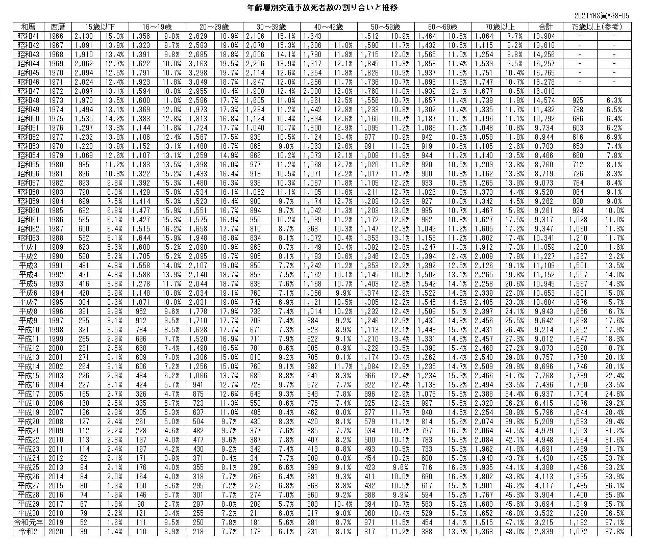 ・その形態を問わす交通事故で亡くなった方の数は第2次交通戦争期の1990年に記録した11,227人をピークに減少を続け2020年には4分の1の2,839人になったが、交通事故で亡くなる高齢者数は増加を続け2020年には70歳以上の死者数が全体の48%に達した。