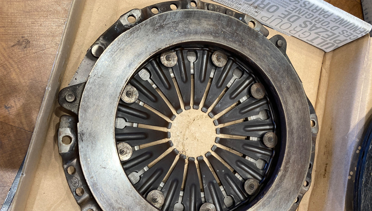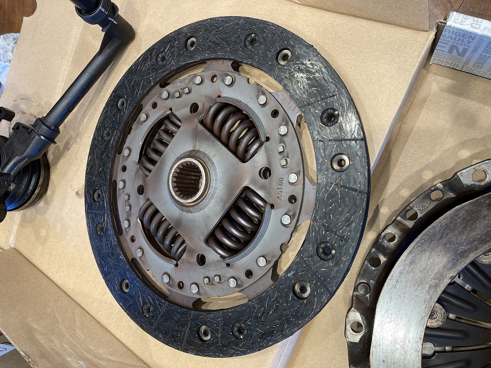 クラッチレリーズシリンダーからのクラッチフルード(ブレーキフルードと共通)漏れが発生しまして、クラッチペダルが戻ってこなくなりました。シフトチェンジができなくなりましたので、いつもお世話になっているルノー滋賀栗東に入庫です。写真は交換したクラッチレリーズシリンダーと合わせて交換したクラッチ板とクラッチカバーです。クラッチ板の消耗は少ないです、とメカニックの方にコメントいただきましたが、今回はクラッチフルードが付着してしまったので交換です。交換後はクラッチのフィーリングが変わりました。交換して良かったです。