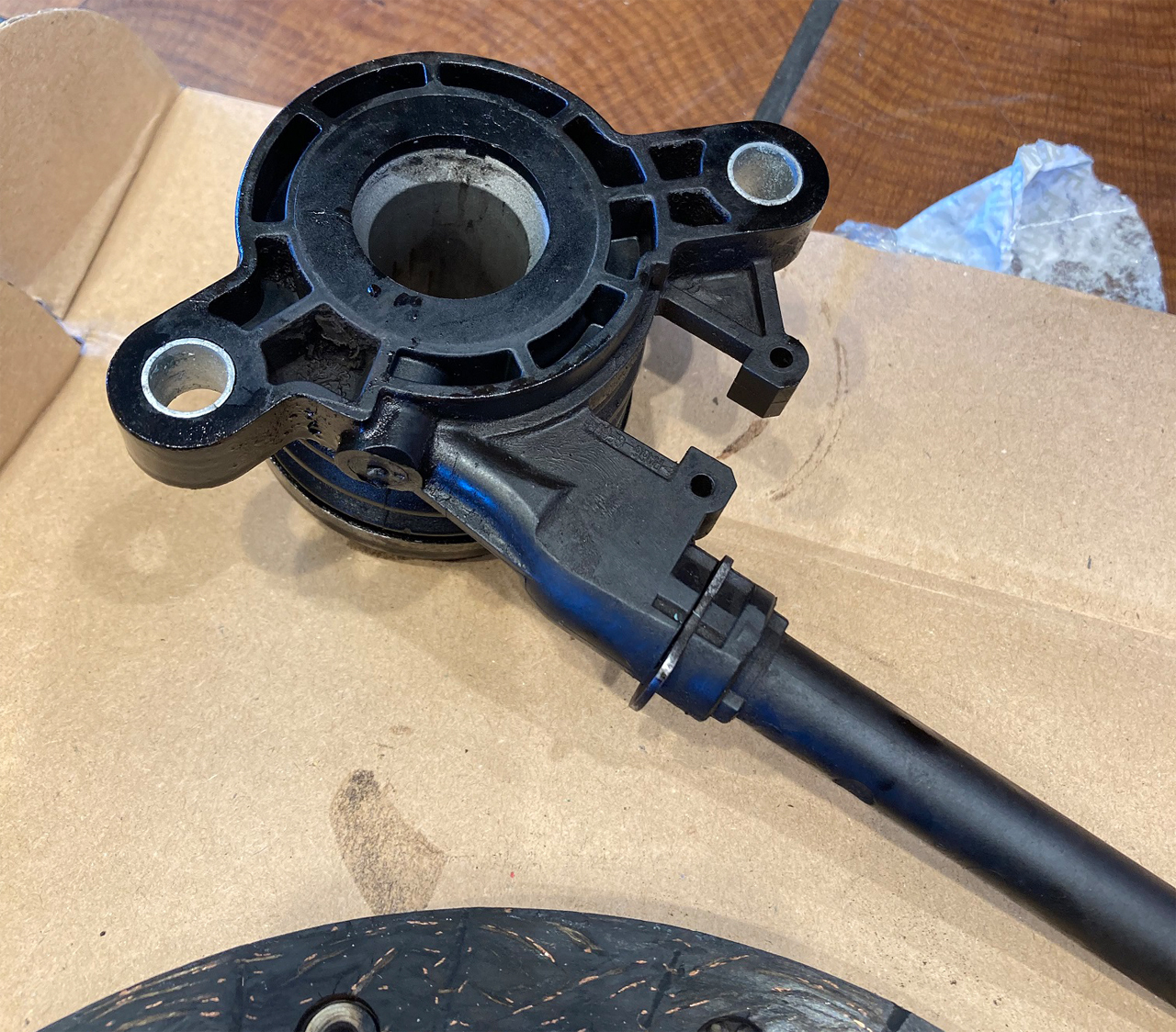 ・シリンダーアセンブリー #306206627R (レリーズベアリングとクラッチシリンダーの一体部品です。今回、このシリンダー部が壊れてオイルが抜けてしまいました。そのオイルがクラッチ板とクラッチカバーにべったり付着して交換となりました。クラッチ板の摩耗状況は「減ってないので使える」レベルでしたが、メカの方からクラッチカバーと合わせて経年劣化があるかもしれないので今回交換を実施した、とのことです)