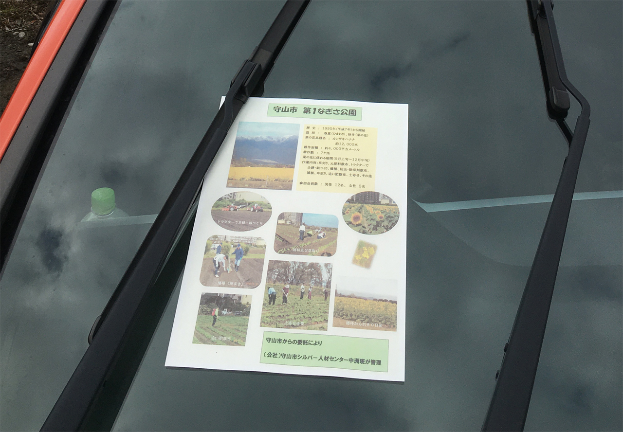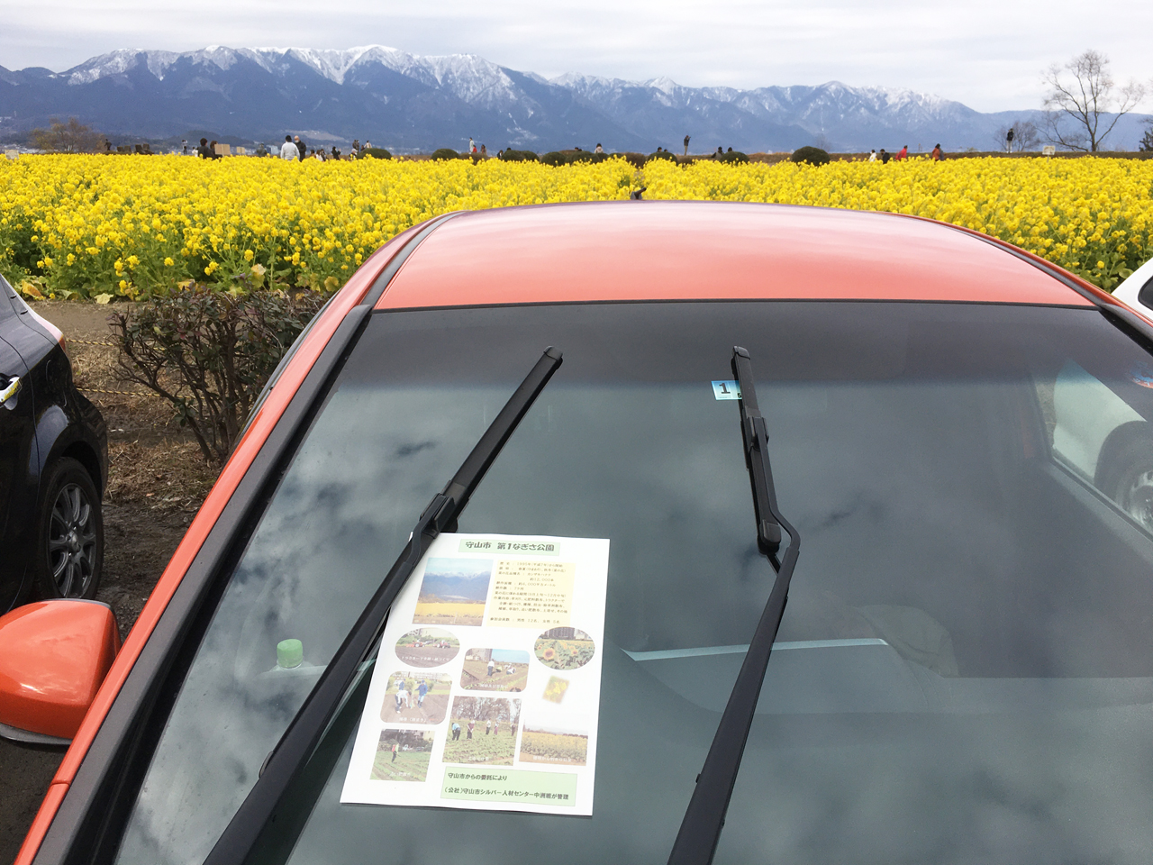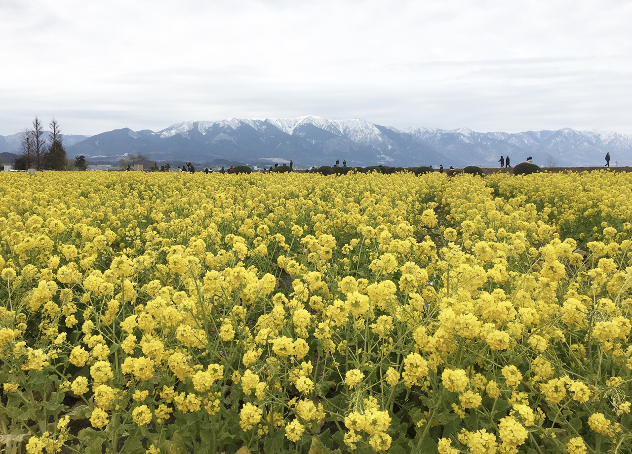 寒さが続き路肩にはまだ雪が残るこの季節に、まばゆいばかりの黄金色。ここは守山市第一なぎさ公園。守山市が地元のシルバー人材センターに委託して1995年から公開している第一なぎさ公園。冬には菜の花、夏にはひまわりが咲き乱れる景色を味わえる。