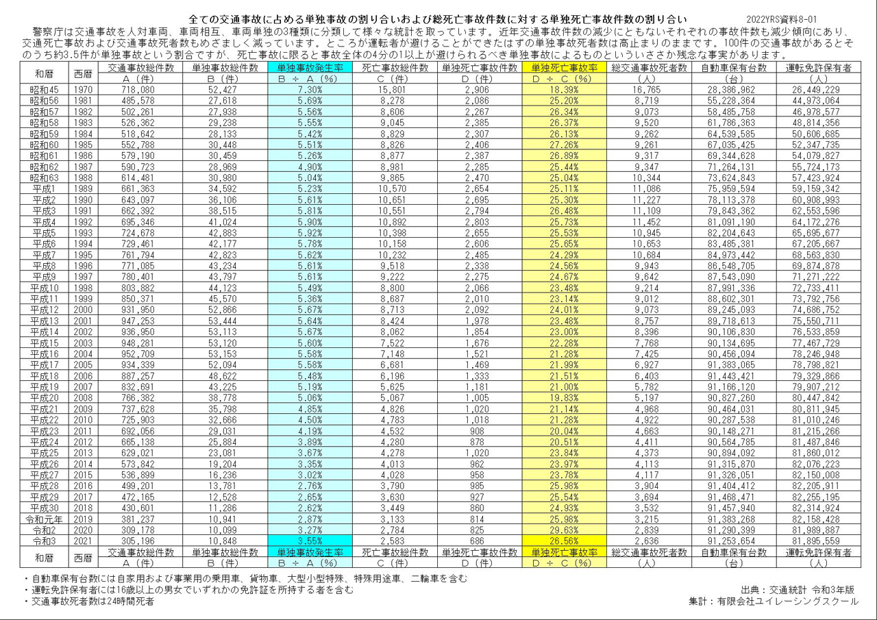 しかしながら交通事故総件数に対する単独事故件数が4%未満なのに、死亡事故件数からみると実に4分の1、つまり25%以上が単独事故によるものだというのは悲惨と言う以外にない。繰り返しになるが、単独事故とはすなわちひとり相撲をとったわけで第3者の関与はないのだから、事故原因がどうであれ運転していた人が避けようと思えば避けることが可能だった事故であることに間違いはない。