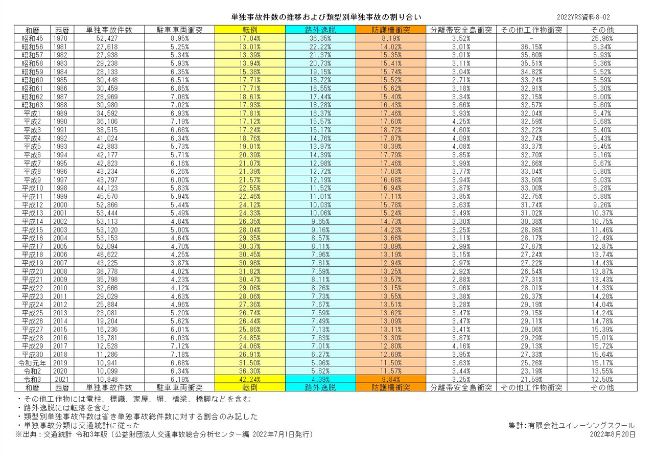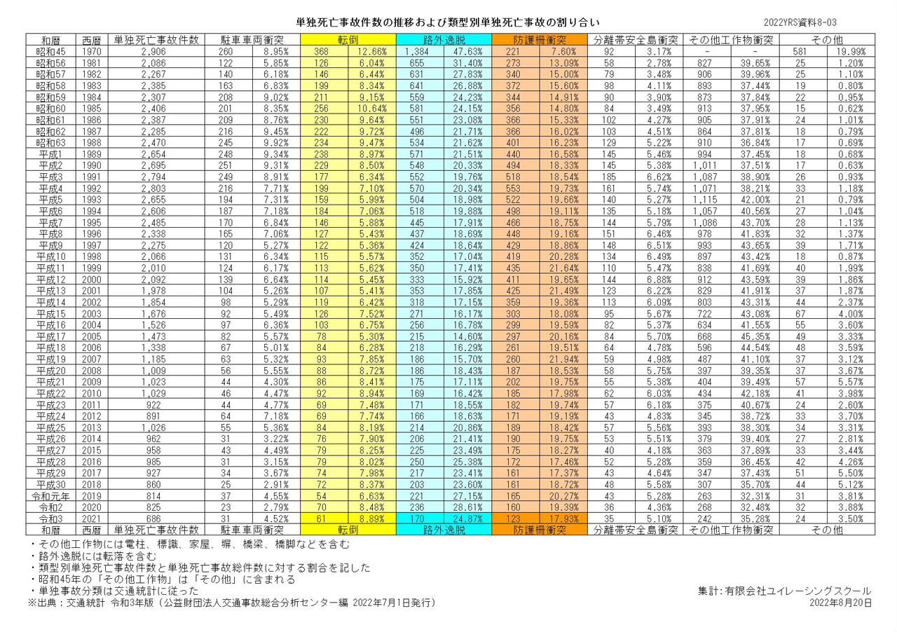 資料8-02には類型別の単独事故件数とその割合、資料8-03には類型別単独死亡事故の件数とその割合をまとめてある。車両の安全性が高まったことや、交通環境が整備されつつあることも要因なのだろう。時とともに単独事故の形態も変わってきてはいる。しかし原因がうっかり運転なのか操作ミスなのか、あるいは技量不足なのかは不明だが、事故を起こす前にできることはなかったのかと他人事ながらに悔やまれる。このブログに目を通していただいている方は単独事故とは無縁だと思うけれど。