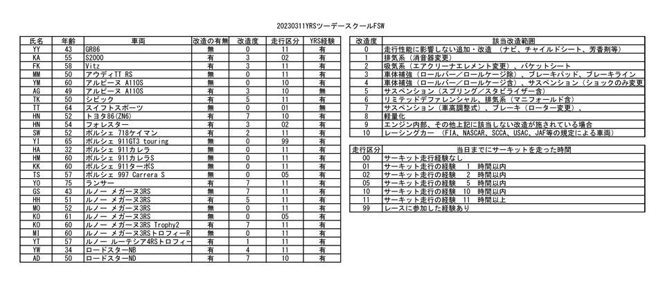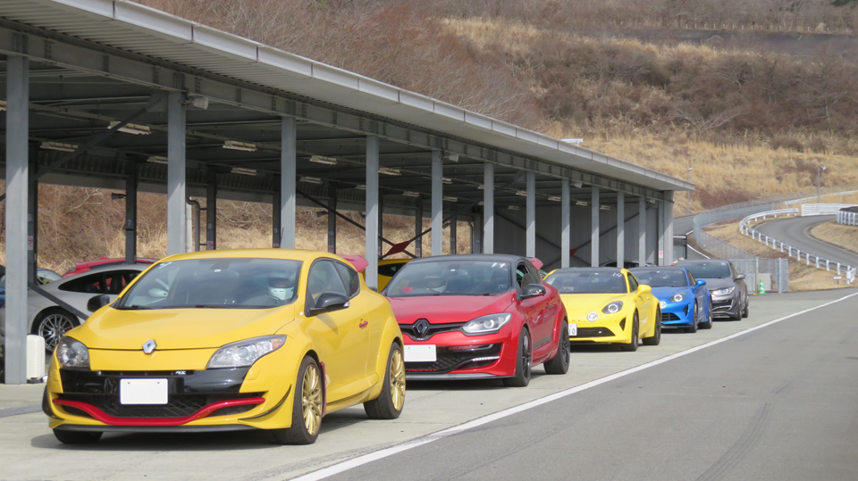 今回が32回目のYRSツーデースクールFSWには27名の方が参加。1日目のブレーキング、スラローム、定常円とオーバル、2日目のショートコースと真剣に楽しく走り回りました。ちなみにショートコースを最も多く周回したのはメガーヌRSに乗るOさんの138周でした。