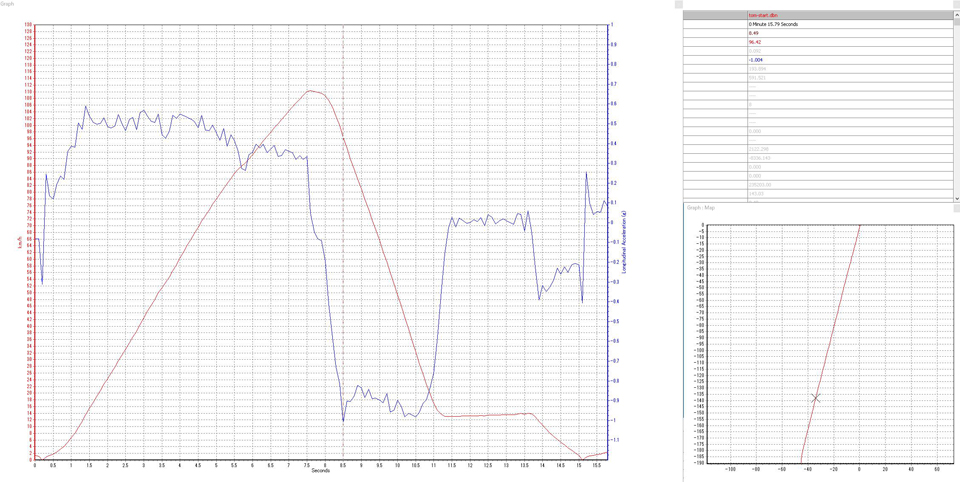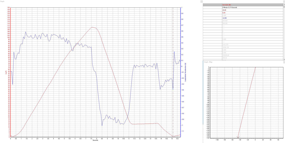 ※ 加速距離を稼ぎたかったので、このランはスロットルオフを遅らせクルマが完全に下り坂に降りてからブレーキングを開始した。下り坂で前輪に急な荷重がかかった結果である可能性もある。 って、言い訳ですけど。