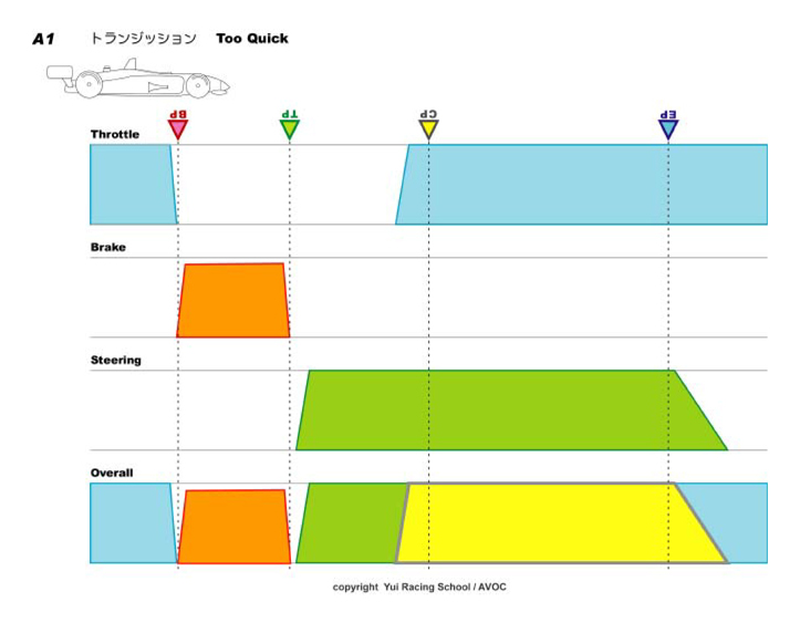 あるコーナーへの進入から脱出までのスロットル、ブレーキ、ステアリングの各操作とそれらをまとめた結果をイメージした下のイラストで例えるのなら、イラスト1ではなくイラスト2でもなく、最終的にイラスト3のような操作が常にできるようになってもらうのがユイレーシングスクールが目指すところだ。