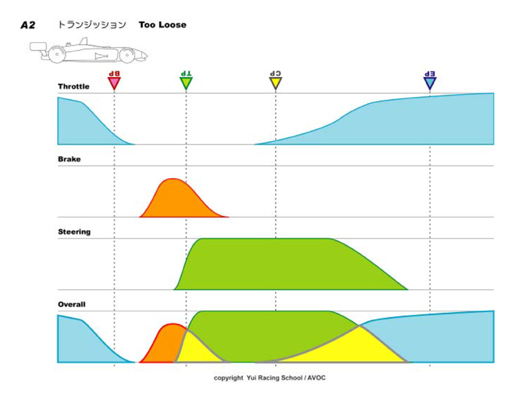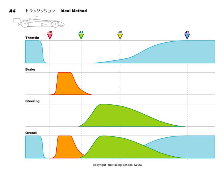 ユイレーシングスクールはビークルダイナミックスを説明したイラストを使った朝一番の座学でクルマの動かし方を理論的に説明します。実技では理論に基づいたアドバイスをFMラジオを使ってリアルタイムで繰り返し、参加された方の操作と理論との乖離を修正し続けます。