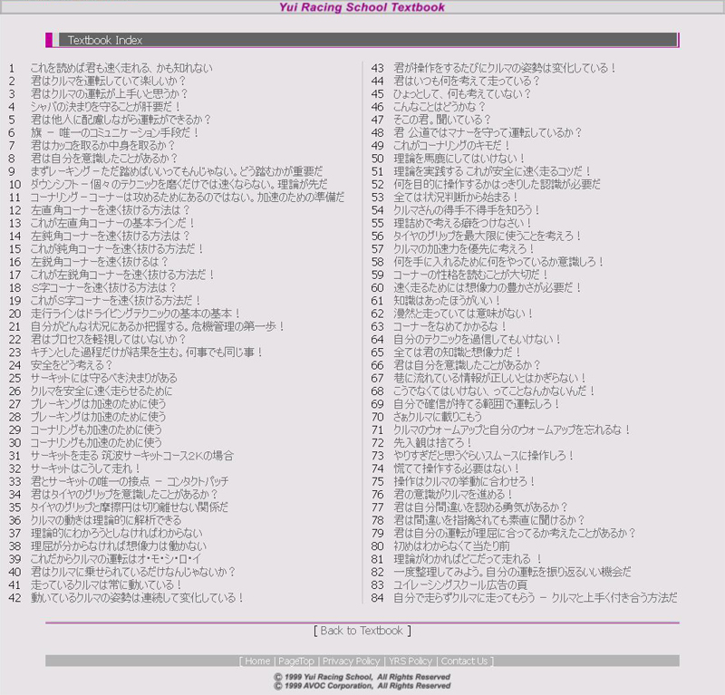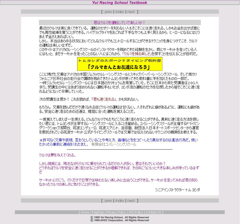 ユイレーシングスクールは今から23年前、1999年12月の開校と前後して、Webサイトで84頁にわたる教科書を公開した。