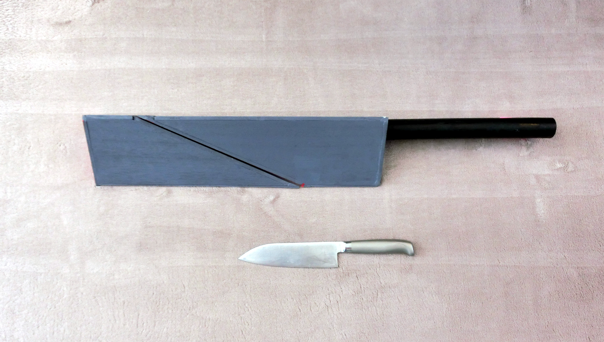 で、あまりにも反応がないので全長79センチの包丁を作った。もちろん木製だ。これを座学で見せれば少しは興味を持ってくれるかな、と期待した。