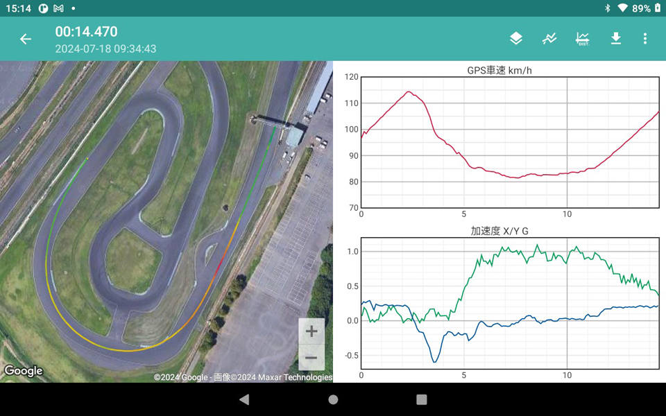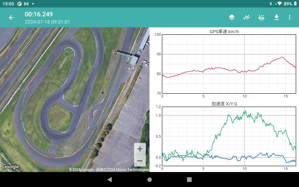 このアプリの良さは、タブレット上のコース図をなぞるとその地点その地点の速度と加速度の推移を見ることができるから、カーソルを動かすことにより操作がクルマの動きにどう反映されているか連続的かつ視覚的に確認できること。走行中に「突っ込み過ぎは損ですよ」、「ボトムスピードが落ちすぎですね」とラジオでアドバイスしてもイメージしにくいかも知れないけど、このアプリを活用すれば操作の結果クルマがどう動いていたかが明白になりそうだ。