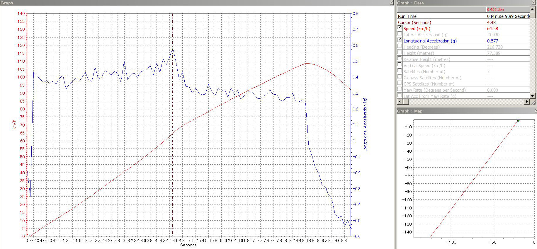 それでもパフォーマンスボックスが集めたデータからは、極めてフラットな加速Gが見てとれる。でも、こんな数値ではないはずなのでルーテシアRSに申し訳なし。