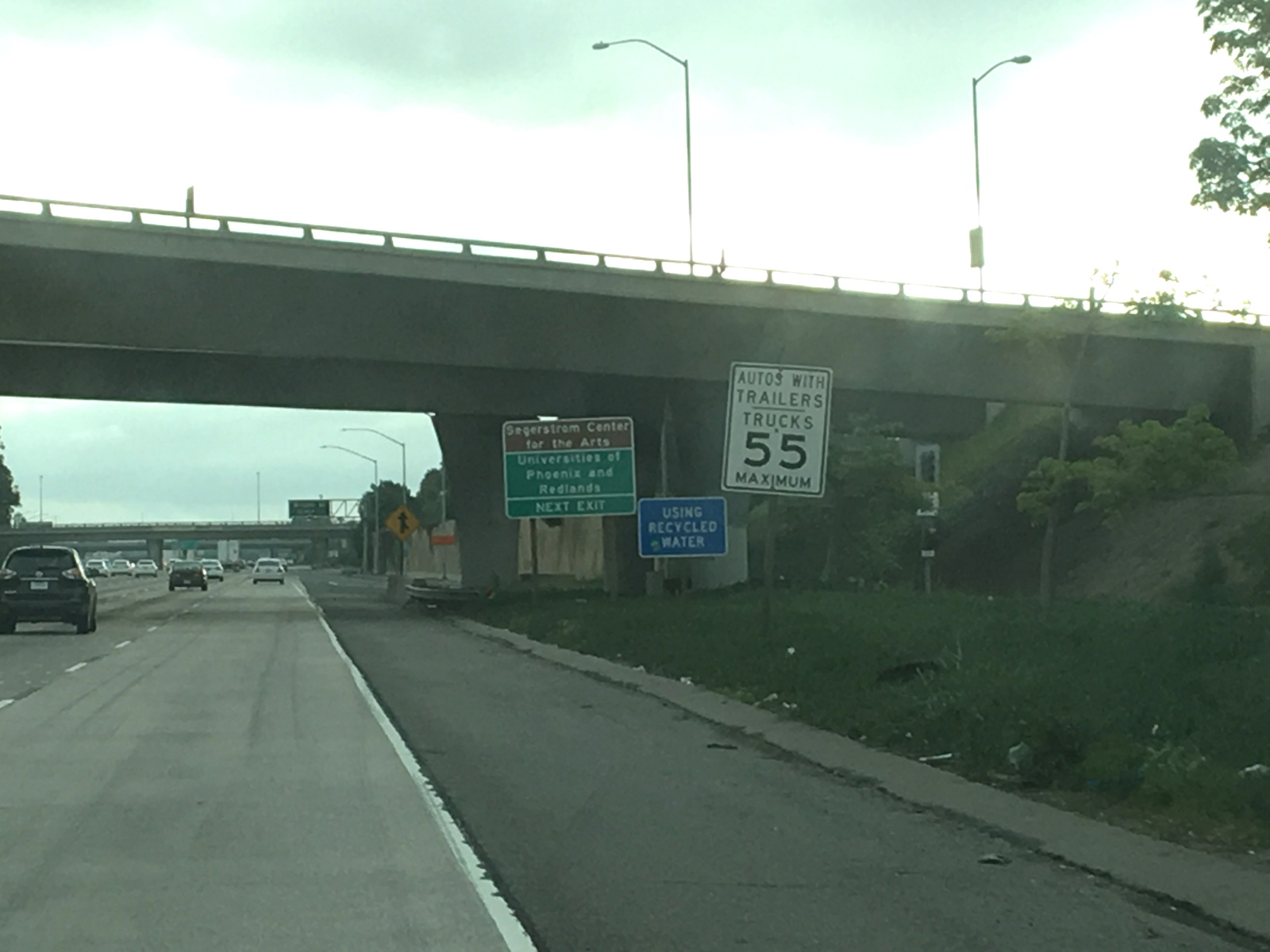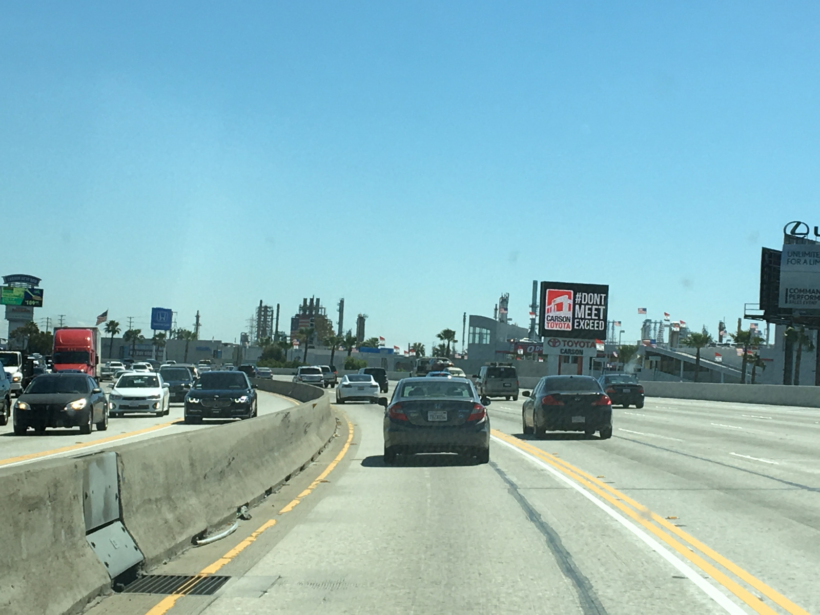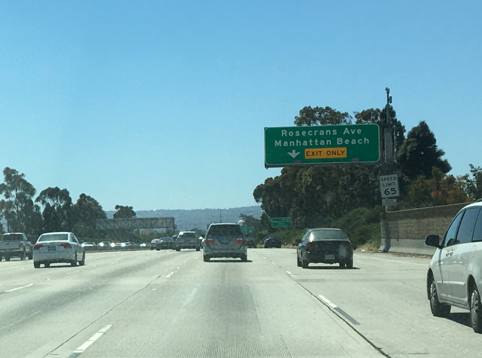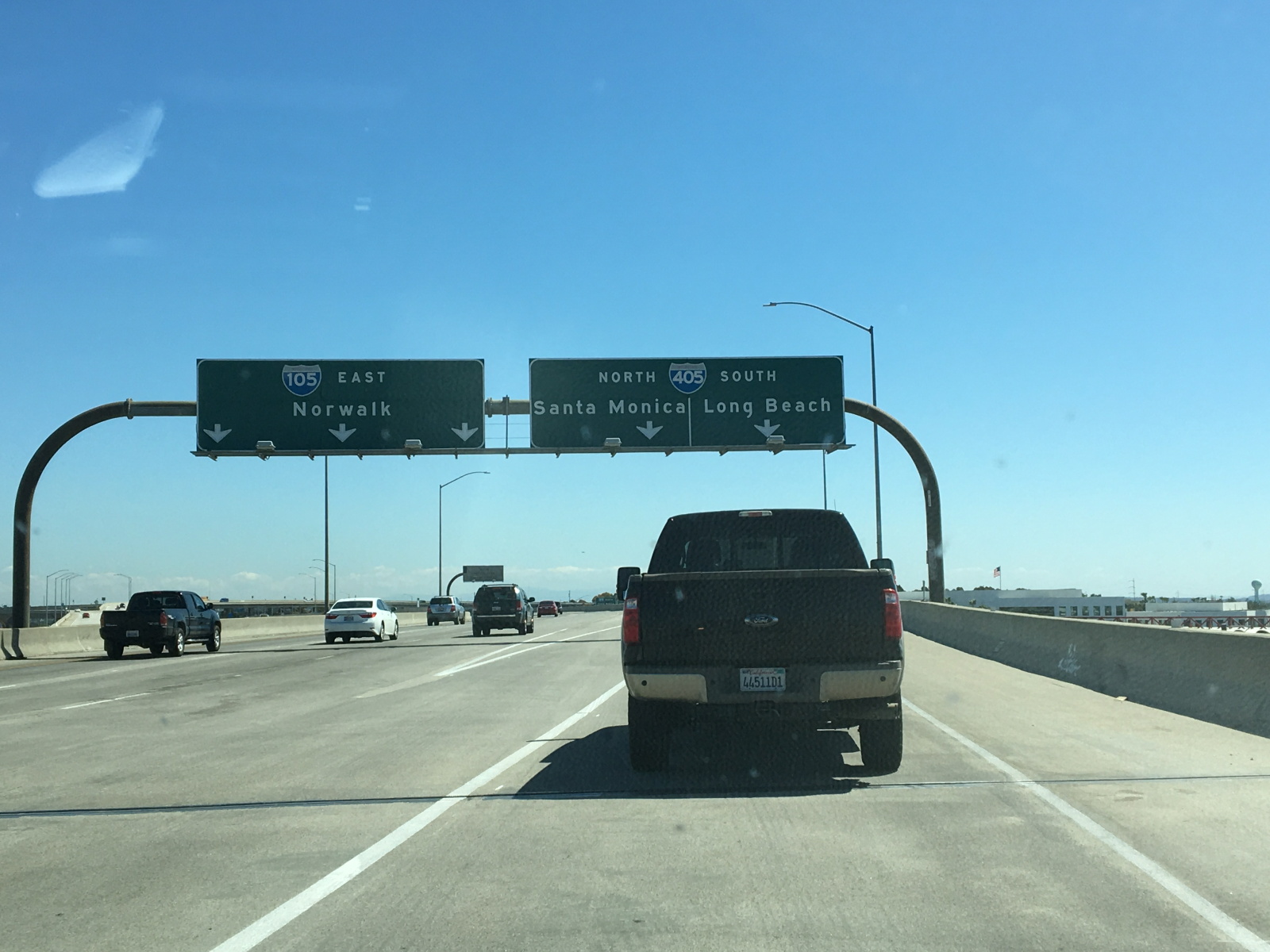 ロサンゼルス空港の周回路の出口で右折してパシフィックコーストハイウエイに合流。滑走路の下をくぐり105Eastに乗って東へ向かう。105フリーウエイはパシフィックコーストハイウエイの西で一般道に変わるのでそれほど交通量は多くない。4車線にクルマが点在する。