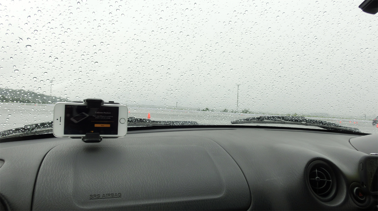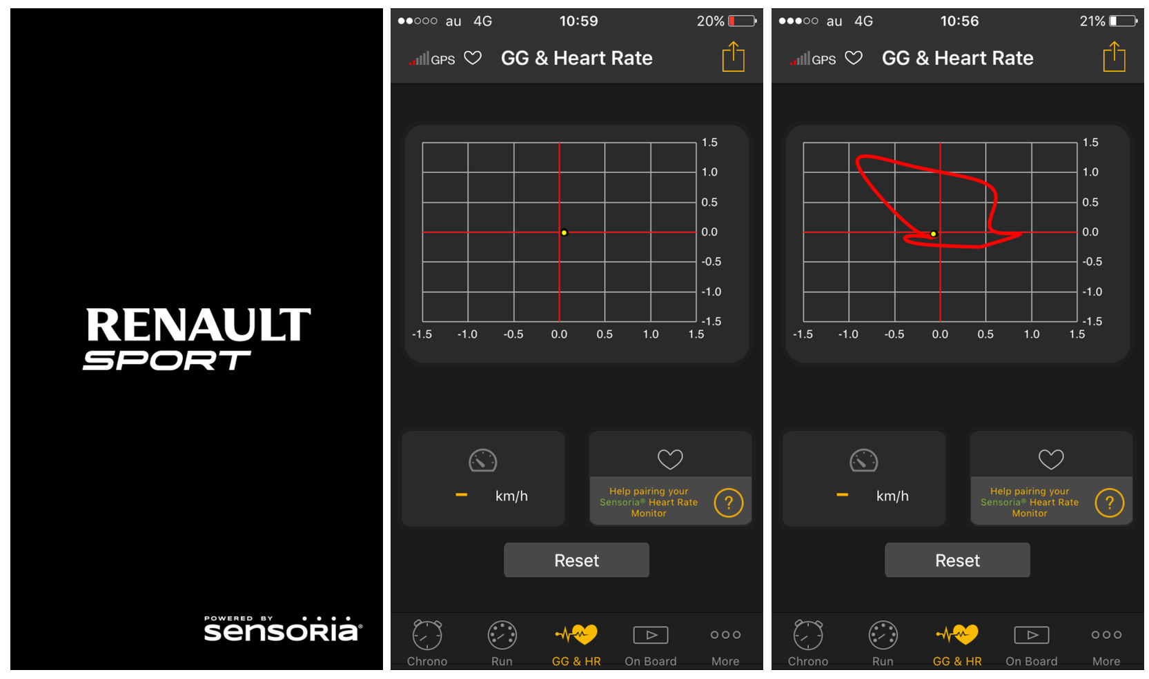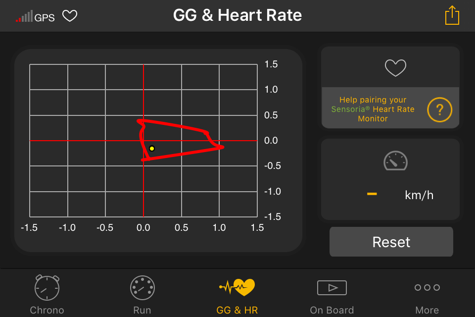 4種類のモードのうちのGモード。Gメーターのようなものでクルマに発生した加速度をグラフにしてくれる。これを使って、『コーナリング中のクルマがオーバーステアになった時に横向き加速度がどう変化するか』を見てみたいと思ったのだ。