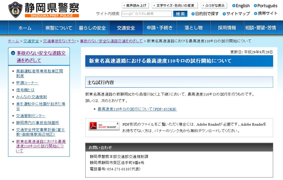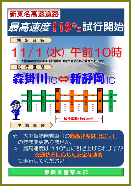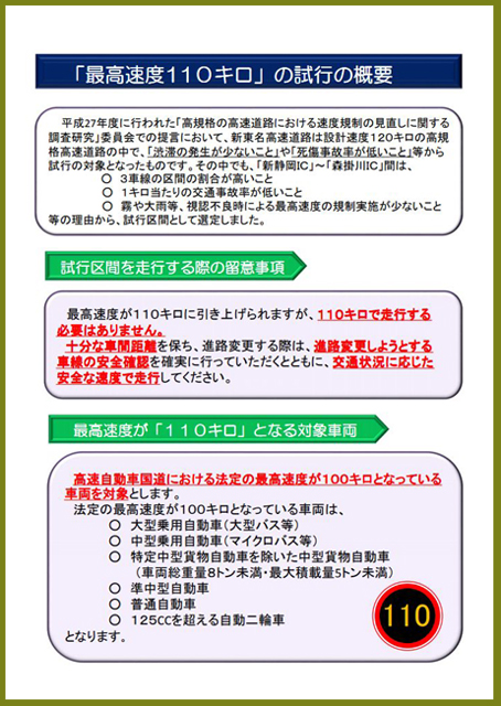 静岡県警がpdfファイルで用意した『最高速度110キロ試行』のパンフレット全4枚。