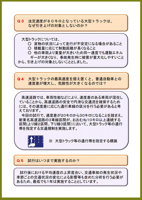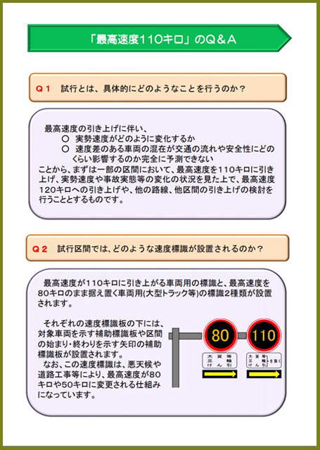 1年間試行を続けるらしいが、せっかく制限速度を110キロに引き上げ、さらには120キロ制限も視野に入れているというのだから、80キロ車両と110キロ車両の高速道路における住み分けをもっと明確に法制化して取締りを強化すべきではないのか。少なくとも2車線区間でも3車線区間でも80キロ車両が追い越し車線を走ることがないように徹底すべきだ。
