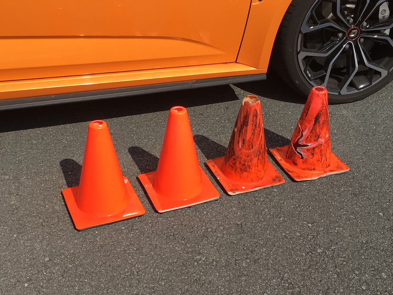 パイロン自体はアメリカ製の柔らかいものを使っているからクルマに傷がつく心配はないのだが、特にインベタの走行では入り口の緑のパイロンから数えて2本目の赤いパイロンが犠牲になりやすい。パイロンを見ながら走っているので、まず前輪でパイロンを蹴飛ばすことはない。コーナーに対して内側の後輪で踏んづけたり蹴飛ばしたり巻き込んだりする。