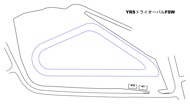 YRSトライオーバルFSWのレイアウトはこんな感じ。フルブレーキングから2速に落として回る低速コーナー、3速全開でアンダーステアを出さないように回る高速コーナー、トレイルブレーキングをしっかり使わないとクルマの向きが変わらない奥の深いコーナーと3種類のコーナーを楽しむ。