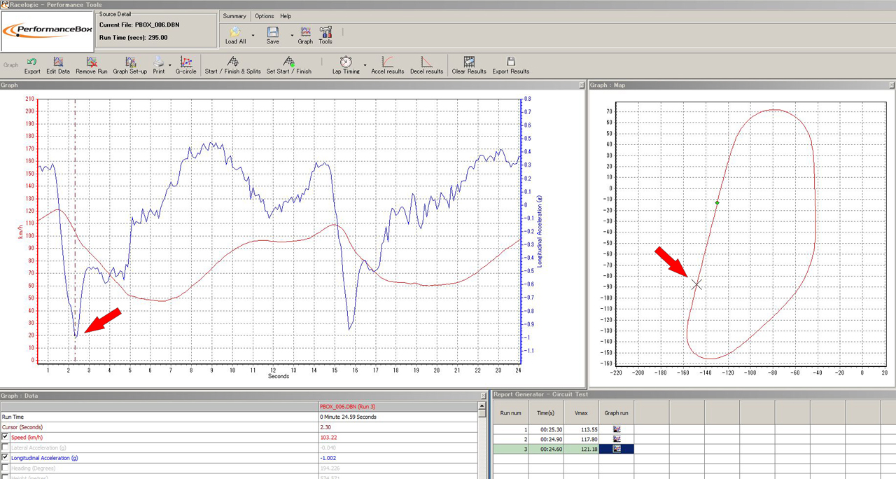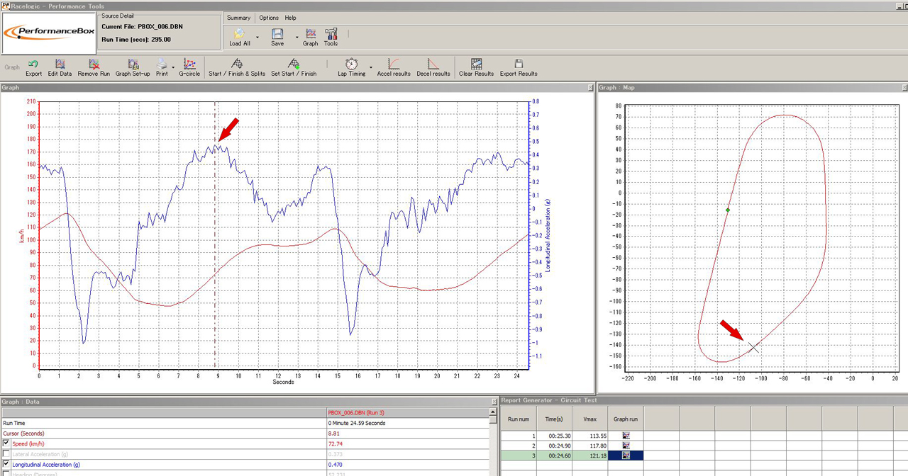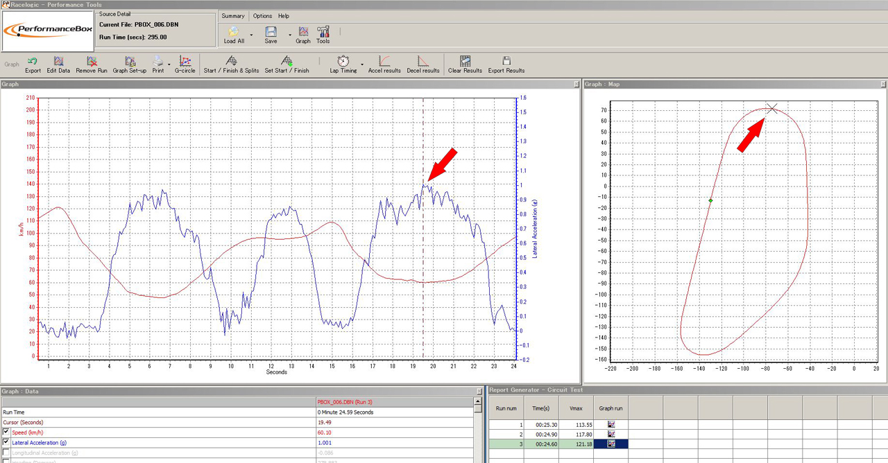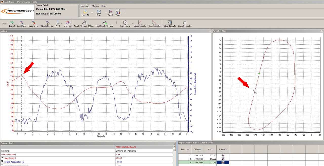 以下のグラフはパフォーマンスボックスというデータロガーに収集したデータを専用の解析ソフトに読み込んだもの。左のグラフは、左の目盛りが速度で右の目盛りは横G、あるいは加減速G。右の図は数値を拾ったコース上の位置を示す。それぞれのピーク時を矢印で示した。