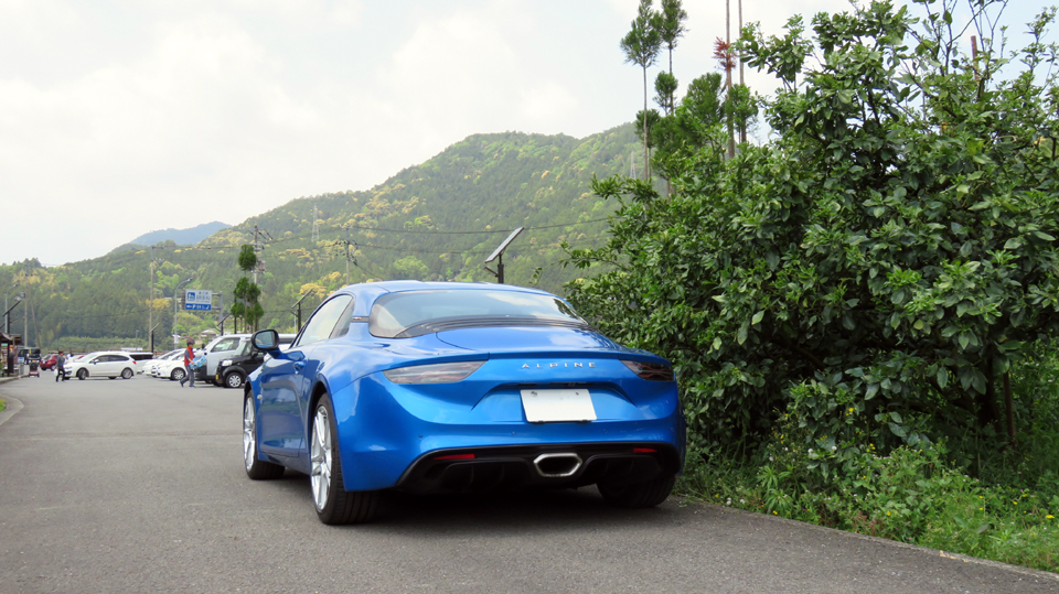 で、四国の山道。「前後のオーバーハングがなくて自分の背中に自転軸があるような曲がり方するよね」、「ブレーキがオーバーにアシストされていないのがいいしイニシャルストロークがカチッとしているのは嬉しいねぇ」、「ダブルウィッショボーンサスペンションって足がよく動いてるってわかるんだよな」、「アンチダイブ/アンチスクワットジェオメトリーになっているのかピッチングが抑えられている気がする」、「背中を押さてのけぞる加速と言うよりクルマが周りの空気と一緒に路面に平行に速度を増す感じだな」。頭の中でブツブツ言いながらA110を味見した。